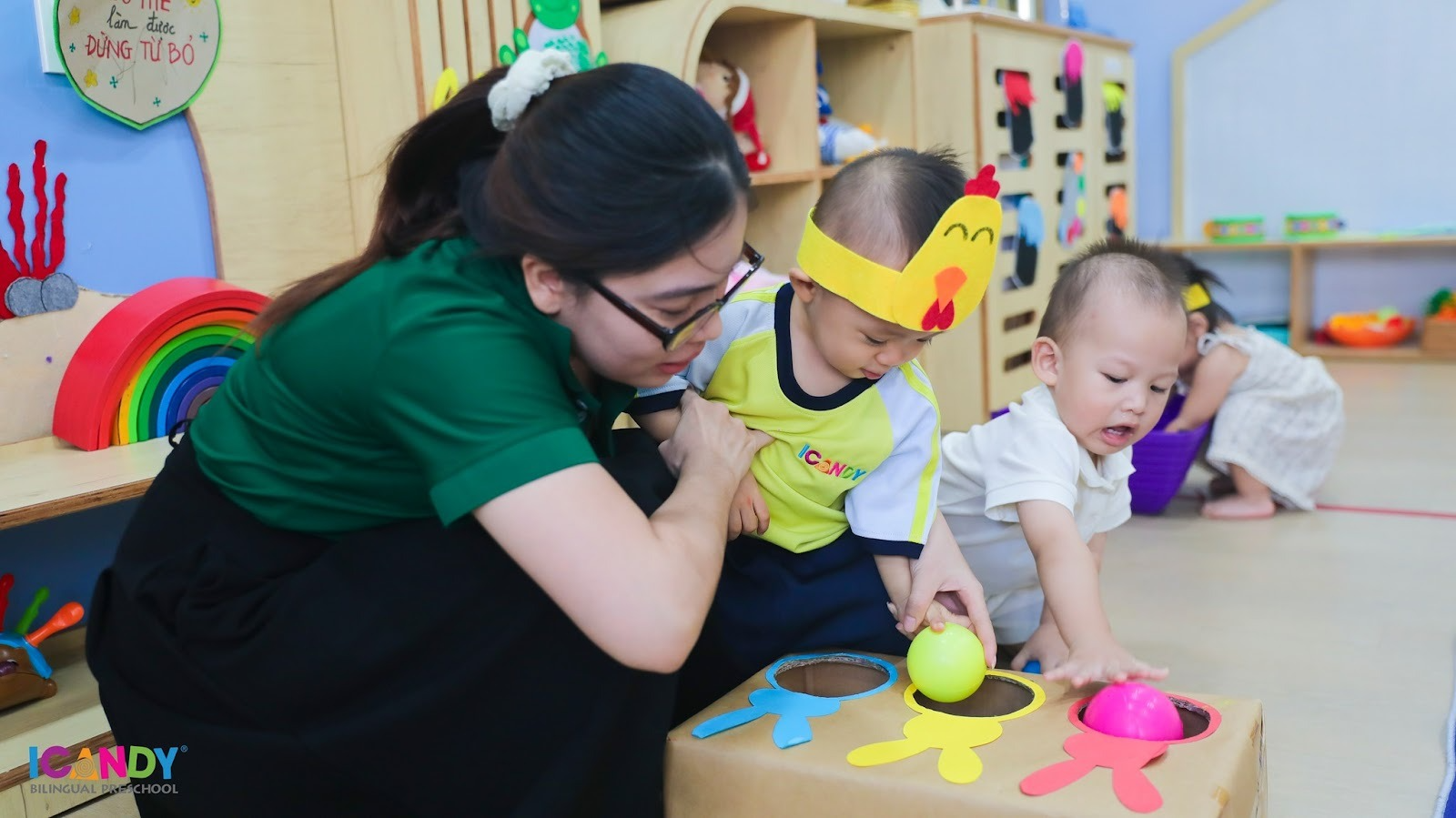 Một trong những điểm nổi bật của ICANDY Preschool là môi trường học tập song ngữ, nơi trẻ được tiếp xúc với tiếng Anh mỗi ngày cùng giáo viên nước ngoài với thời lượng phù hợp theo từng độ tuổi.